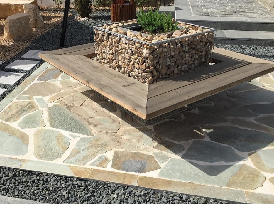 A seating area decorated with polygonal slate can bring a touch of authenticity to the urban garden, as this stone has an uneven appearance and diverse texture, thus making each design unique. The product can also be used to clad pathways or even a small pond in the city center.
