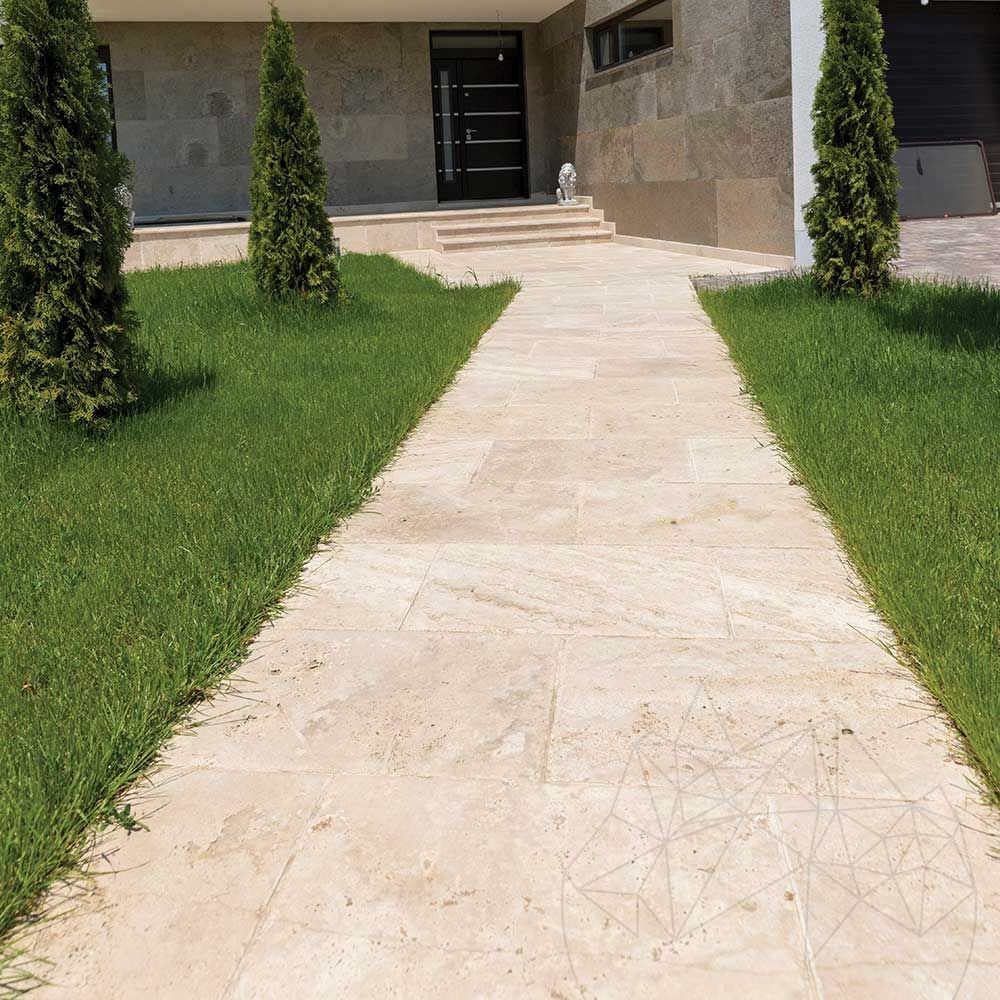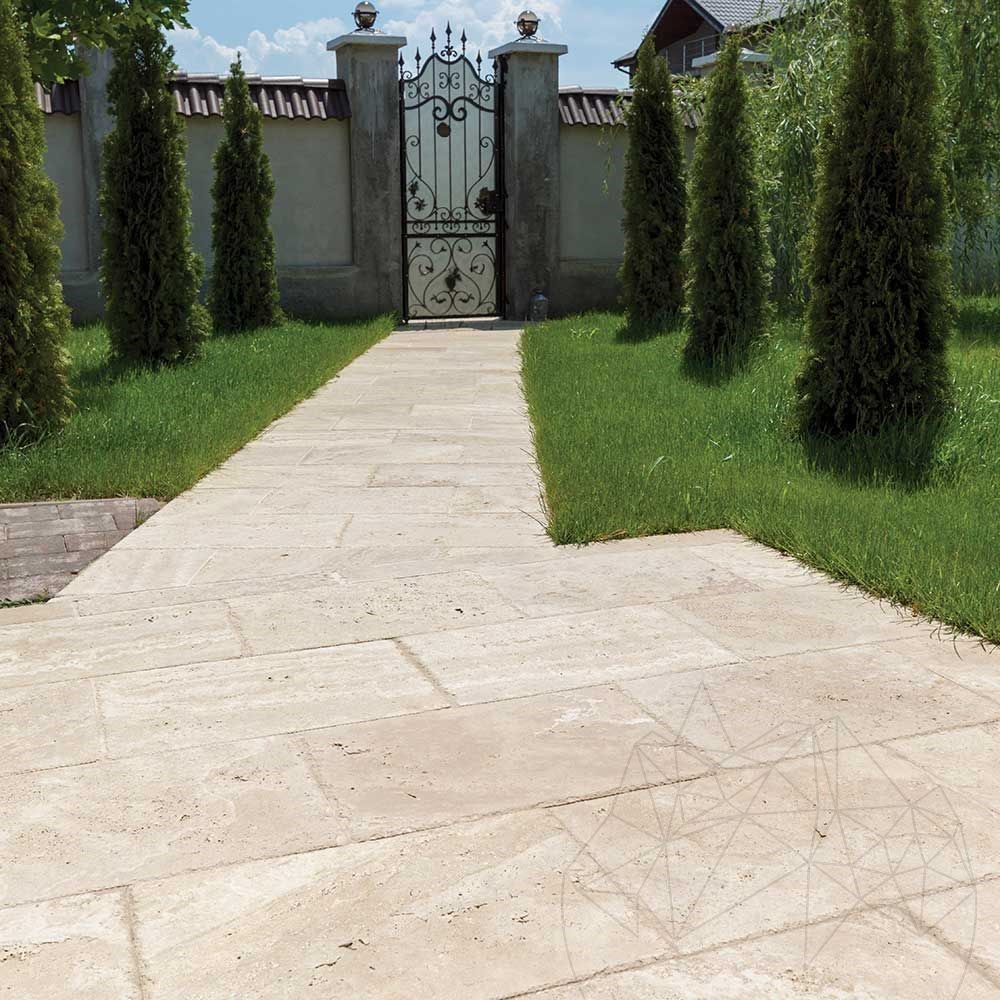 We present a greater, more beautiful new product! The Classic Cross Cut Tumbled Travertine (61x40.6x3cm) is perfect for any terrace, parking lot or pedestrian alley. This product can also be used directly on the ground as Japanese steps.