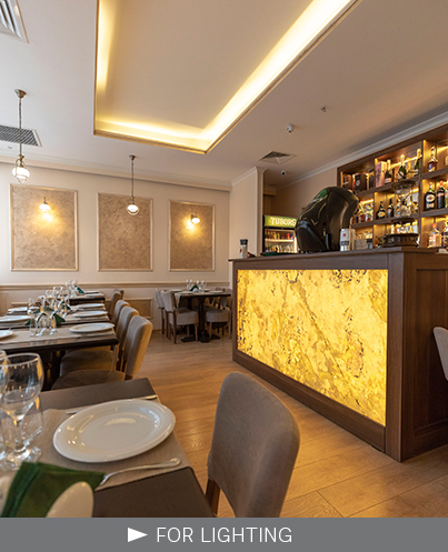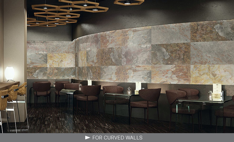 Each sheet of SKIN Flexible Slate is unique because there are two natural textures alike. From the sallow shade textures to translucent patterns that can be brightened, from plain colors to organically patterned textures, the product is available in large sheets, panels, or mosaics.