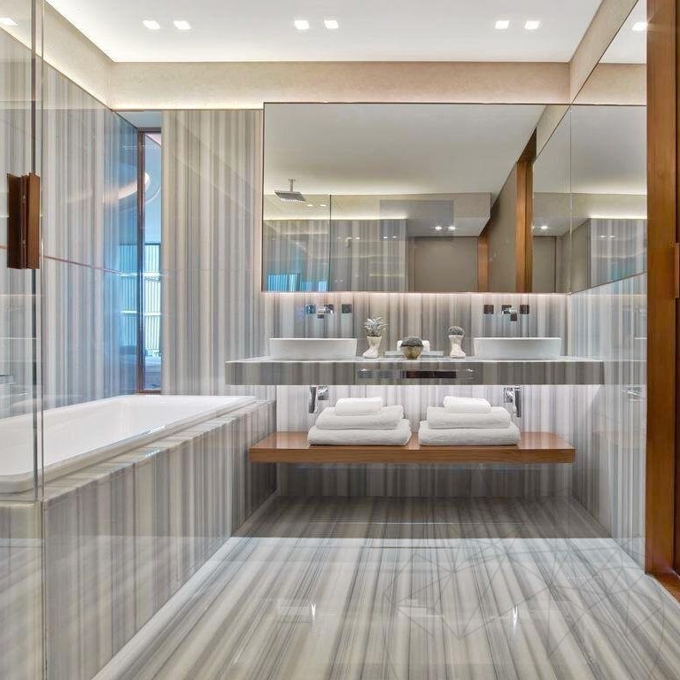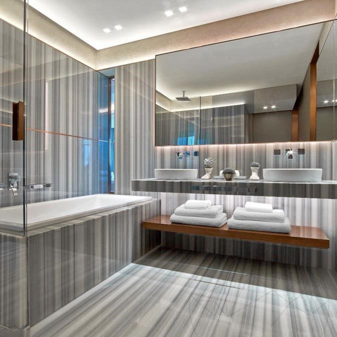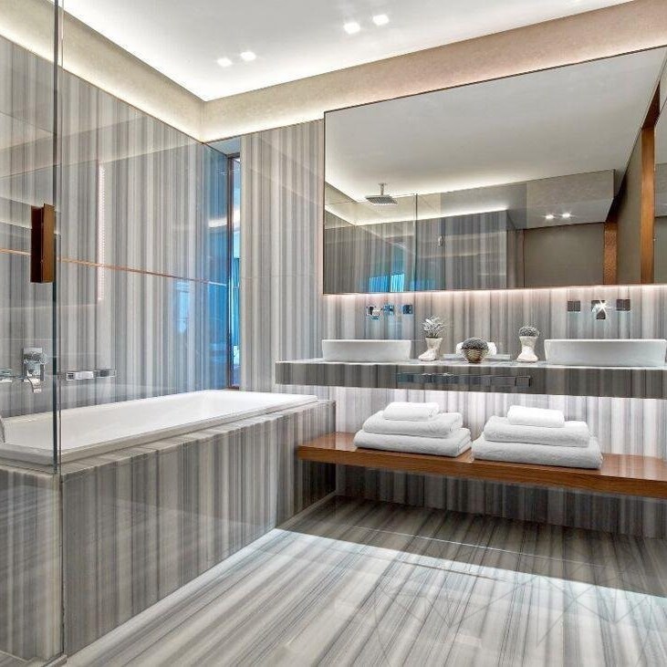 PIATRAONLINE’s product portfolio includes Equator Marble as standard size tiles – 61 x 30.5 x 1 cm – polished finish and ideal for indoor projects – bathroom, kitchen, hallway or living room – even in wet spaces. If you like this marble as much as we like it and if you have a special project, we can deliver special cut-to-size pieces for you such as: window sills, interior stairs, kitchen and bathroom countertops, furniture pieces or bathroom sinks.