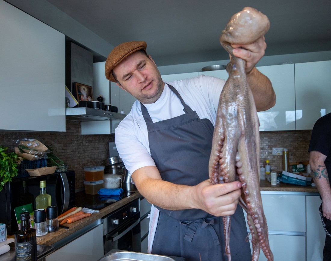 Based on the octopus’ size, simmer it for up to 45 to 60 minutes until it gets fork tender. If it sits too long, it will be "rubbery". Turn off the heat and let it cool a bit, just long enough to hold the pieces in your hand. Under running water, wash the octopus and clean it gently so that you’ll be able to peel off the dark red skin. Put half quantity from the olive oil, oregano and balsamic vinegar into a bowl. And xadd a little salt and pepper. Place the octopus’ slices in this sauce and leave until the grill is properly heated.