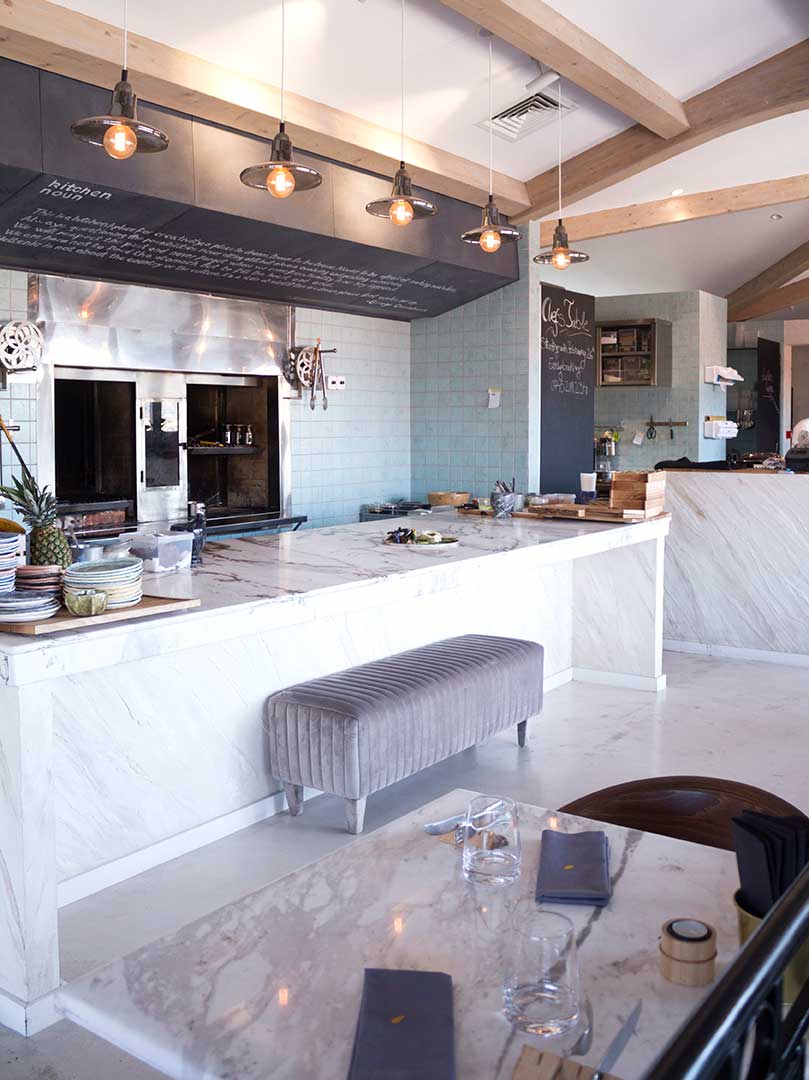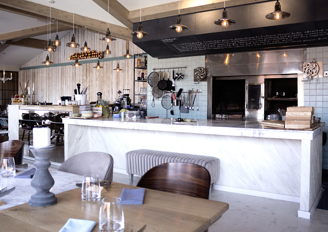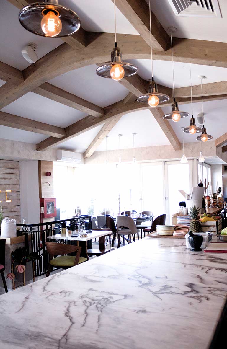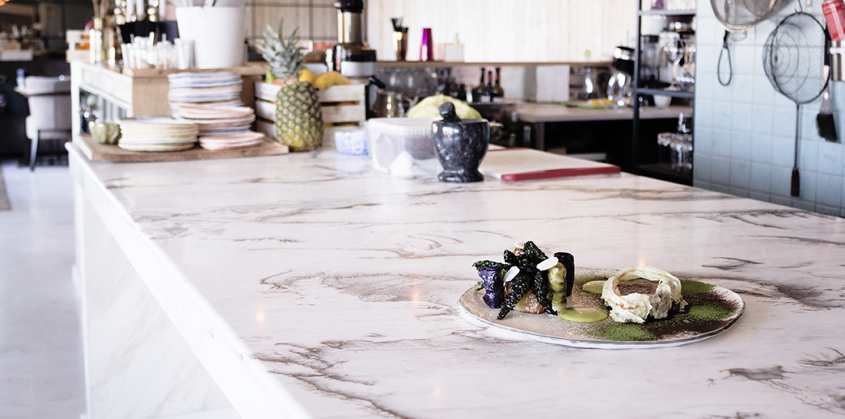 PIATRAONLINE: MAIZE has two Volakas marble countertops. Why did you decide to have natural stone? What is the message conveyed by these marble countertops to MAIZE customers, in a restaurant with the headline "la nouvelle cuisine roumaine"?