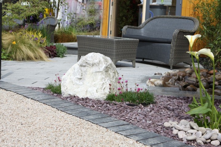 A garden surface covered with this pebble usually looks better when bounded by a solid sidewalk.