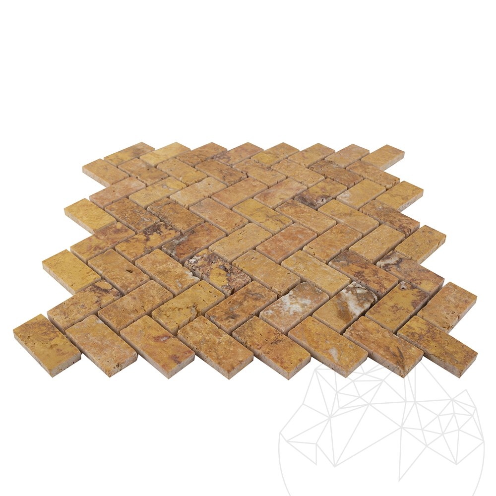 The travertine mosaic offers the advantage of being installed on curved surfaces such as pillars and arches, as well as on drywall surfaces. Its polished finish enhances the natural beauty of the stone, providing an elegant touch to any space.