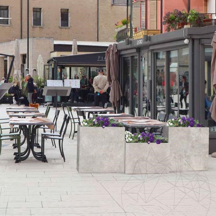 Sintered stone planters are made from the same material as the paving slabs, starting from the same format used for flooring, thus giving linearity, visual coherence and uniformity to the entire ensemble. Equipped with a water drainage hole, the planter ensures efficient moisture management, protecting both its structure and the surface on which it is placed.