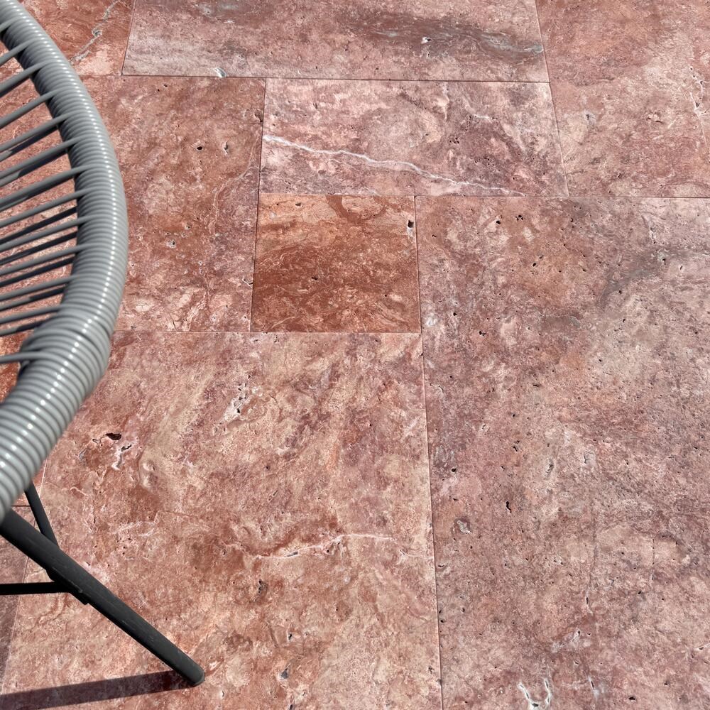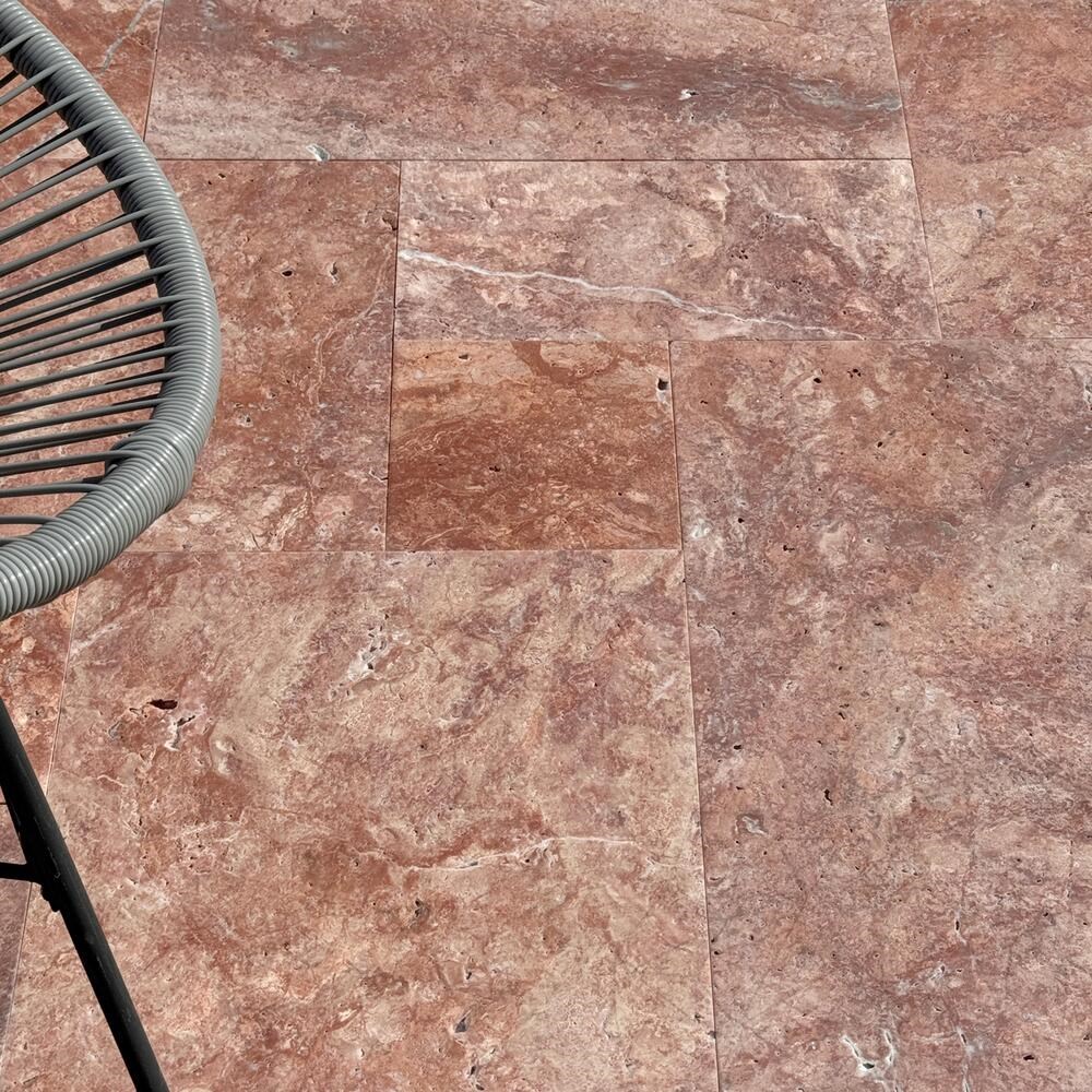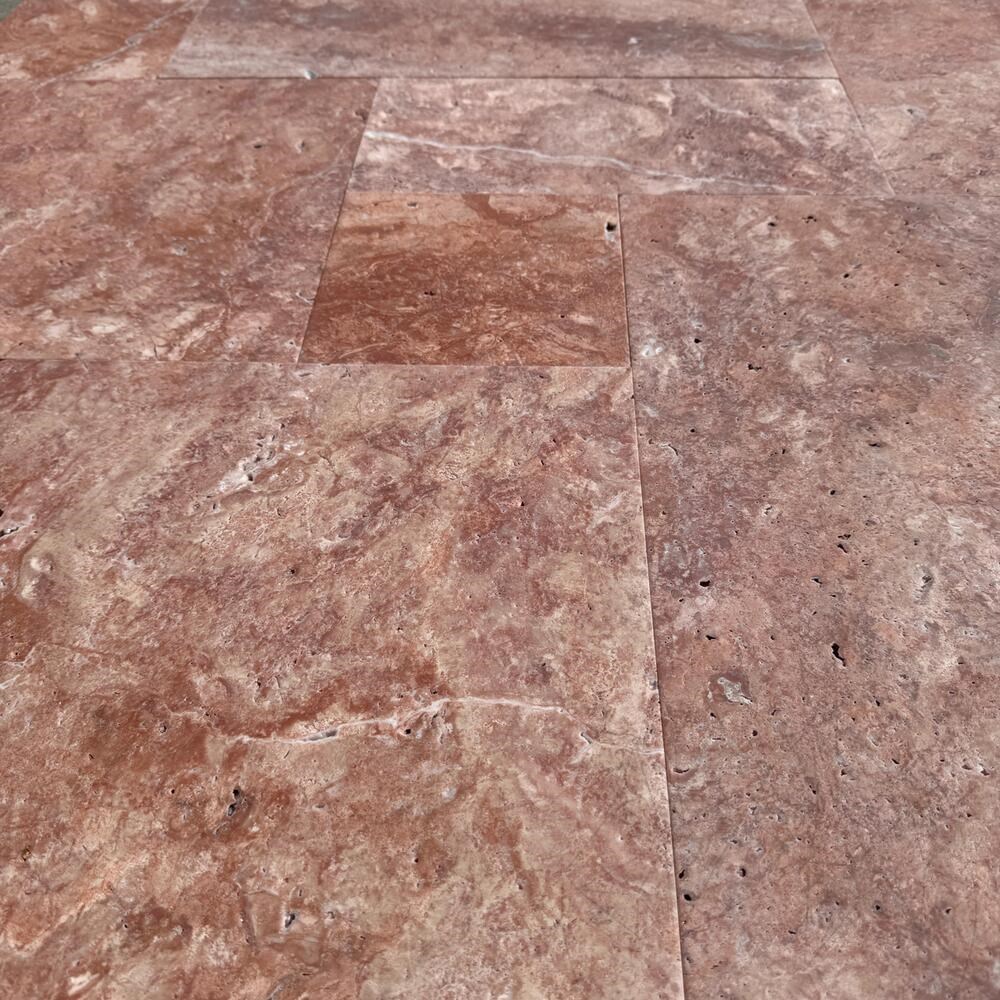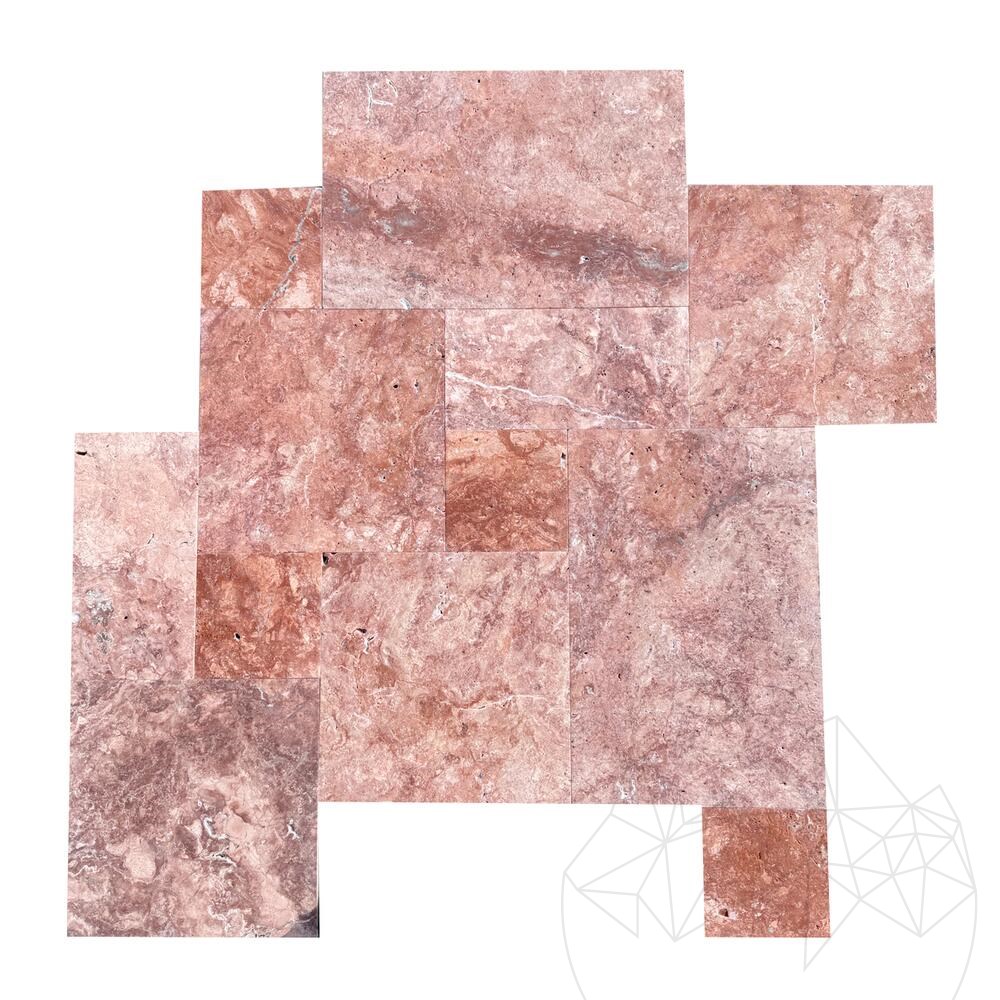 Red Opium Travertine Tiles French Pattern Set can be used as a building material for interior and exterior decoration projects, in areas such as hallways, living rooms, terraces, resting areas between the stairs, entrances, parks, and gardens. The brushed finish is non-slip.