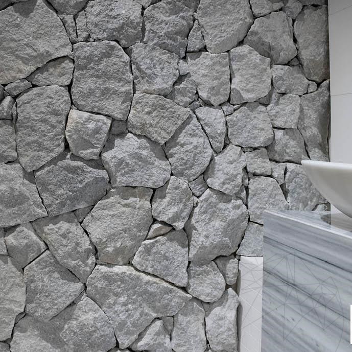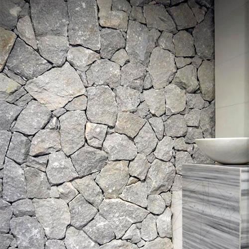 Rock Face Dias Marble conveys a rough appearance into any cladding, promoting a back to basics concept. With a dark grey color and no major color variations, this can be used in both traditional and contemporary buildings. The stone has smooth interiors sides and rough exteriors. Thickness is maximum 7 cm with quite large variation. It is used for cladding facades, walls, fences, poles. It can be installed with or without joints and due to its irregular shape and variable thickness it is mandatory to carefully select the stone before installation.