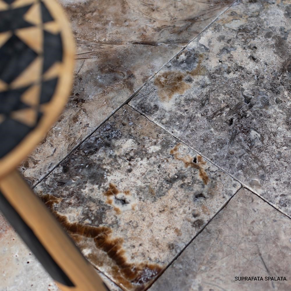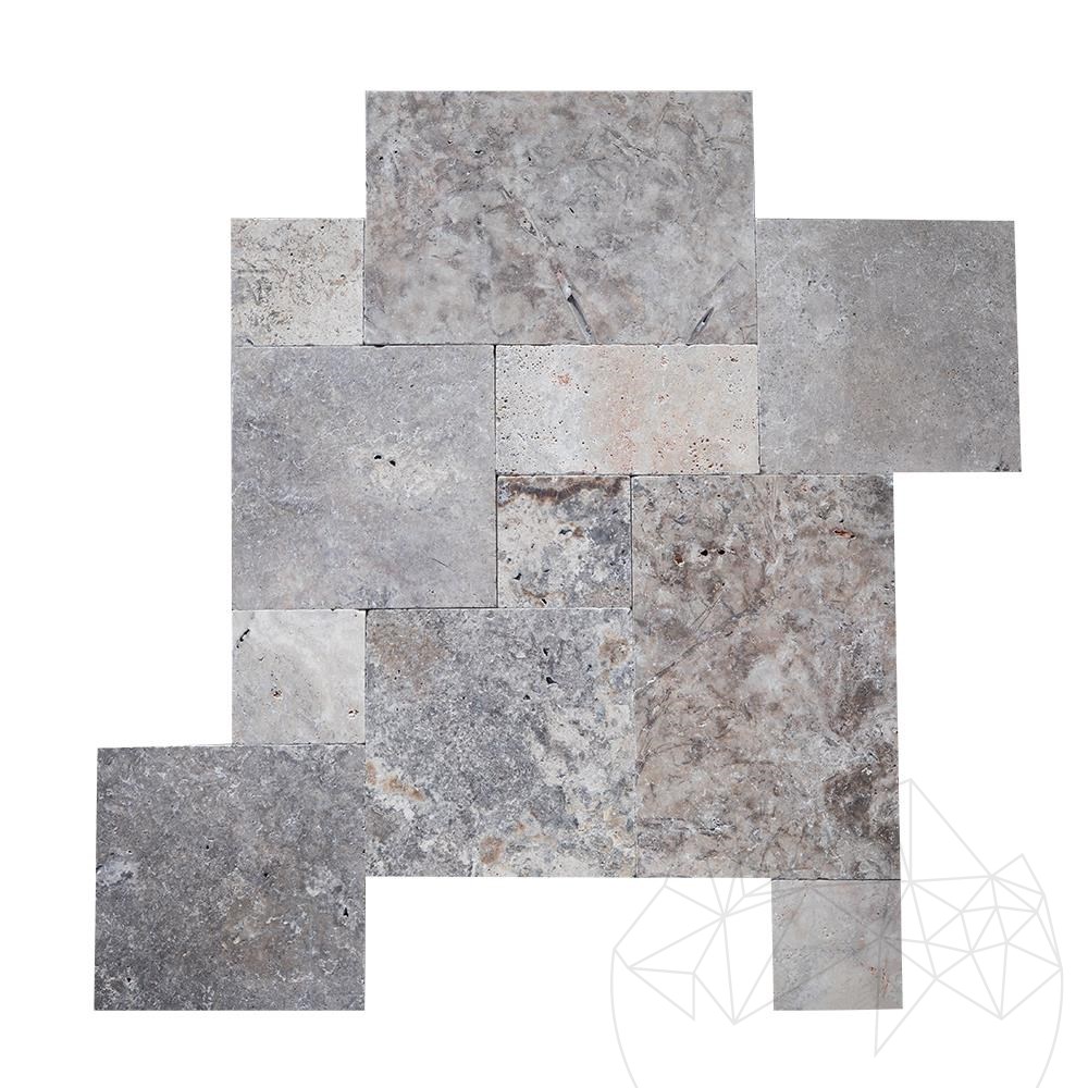 Silver Travertine Tiles French Pattern Set can be used as a building material for interior and exterior decoration projects, in areas such as hallways, living rooms, terraces, resting areas between the stairs, entrances, parks, and gardens. The brushed finish is non-slip.