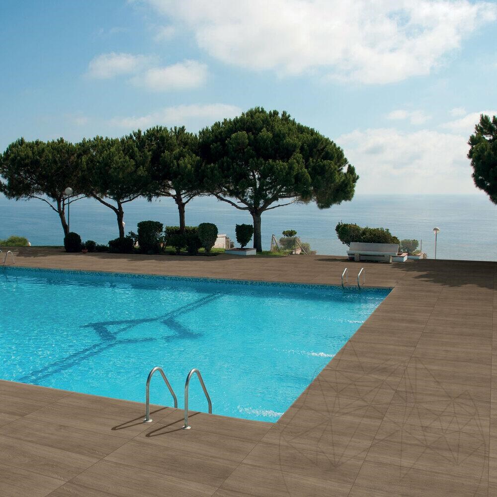 This sintered stone offers unmatched durability, replicating the warm texture of natural wood while providing the strength of full-body colored stone. Its R11 anti-slip surface makes it ideal for wet areas like pool sides, ensuring safety and functionality. Additionally, it is resistant to frost, UV rays, heavy foot traffic, and chemicals, making it a versatile choice for various outdoor applications.